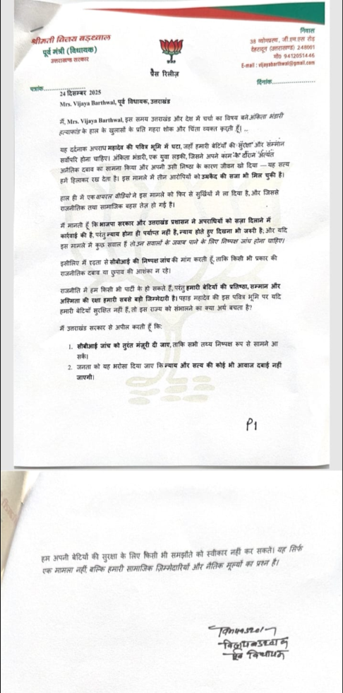 पूर्व विधायक, विजया बड़थ्वाल का पत्र