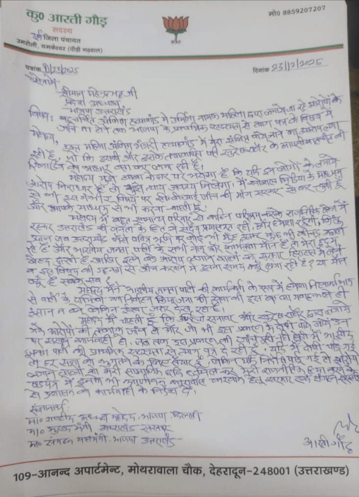 उधर, मंगलवार को ही आरती गौड़ ने भाजपा से इस्तीफा भी दे दिया। आरती का कहना है कि उसने रिसॉर्ट में बुलडोजर नहीं चलवाया। जबकि उर्मिला अंकिता हत्याकांड से जुड़ी उस खबर की कटिंग वॉयरल कर चुकी है। इस खबर में लिखा है कि जिला पंचायत सदस्य आरती गौड़ ने इंजीनियर को बुलडोजर चलाने को कहा था।